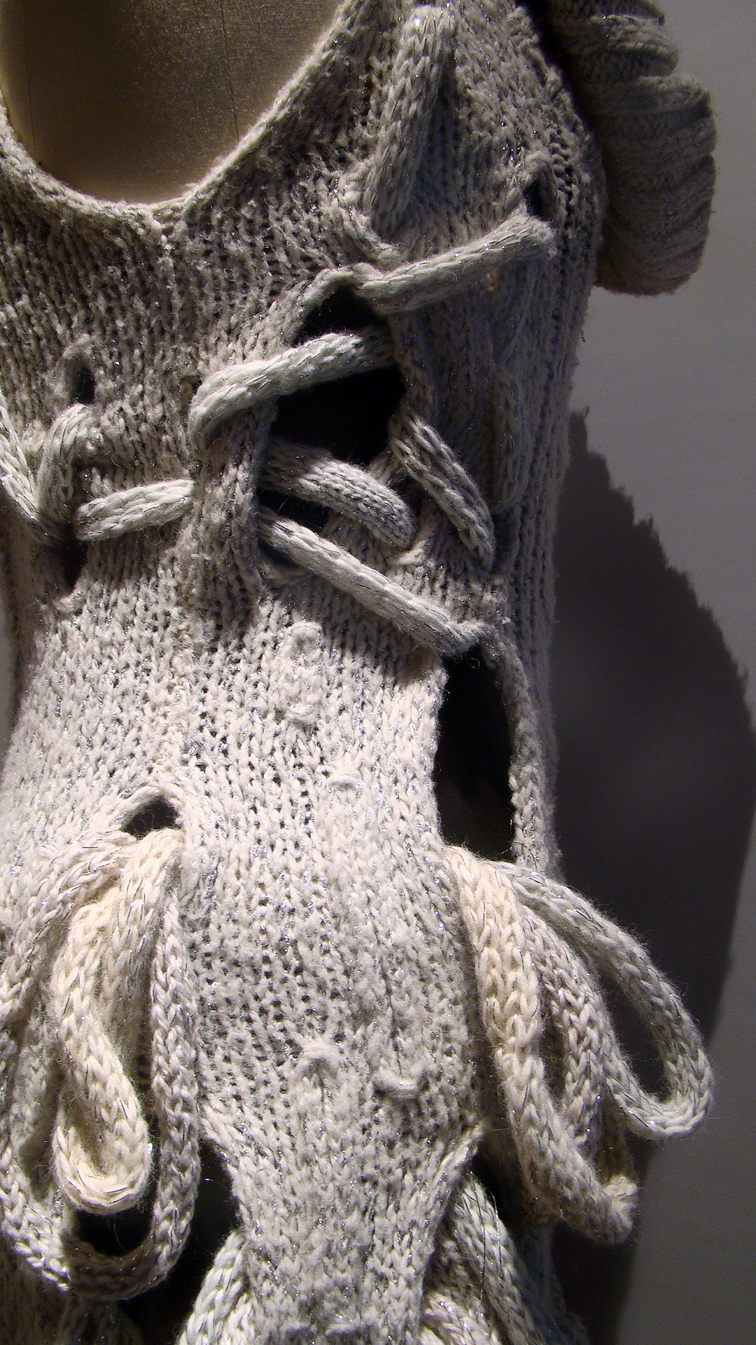 La robe est construite à partir d’un pull vintage dans lequel des trous sont créés où des câbles sont passés pour créer ses formes organiques et multi-dimensionelles sur le corps. En bas une jupe de bourrelets est