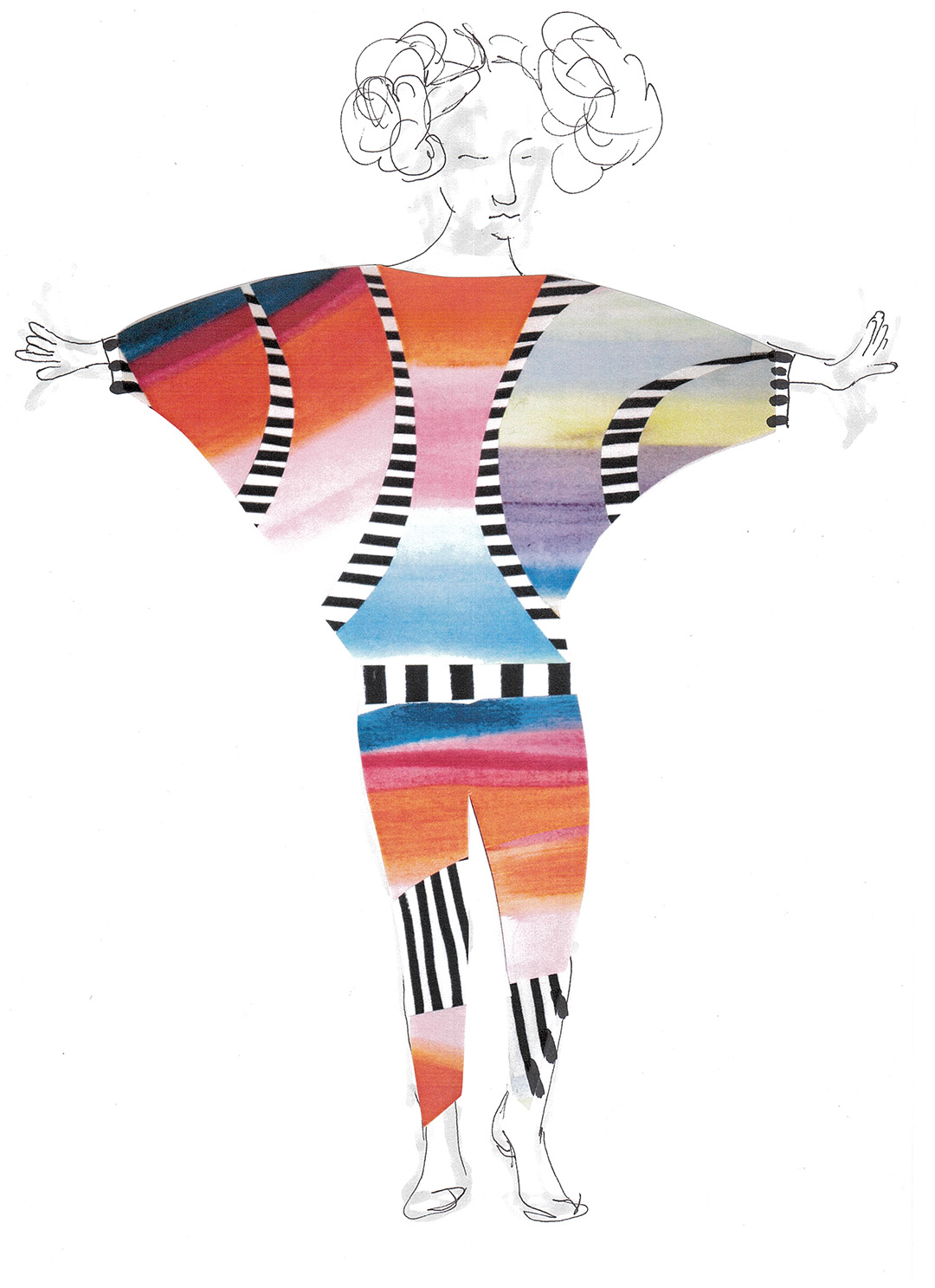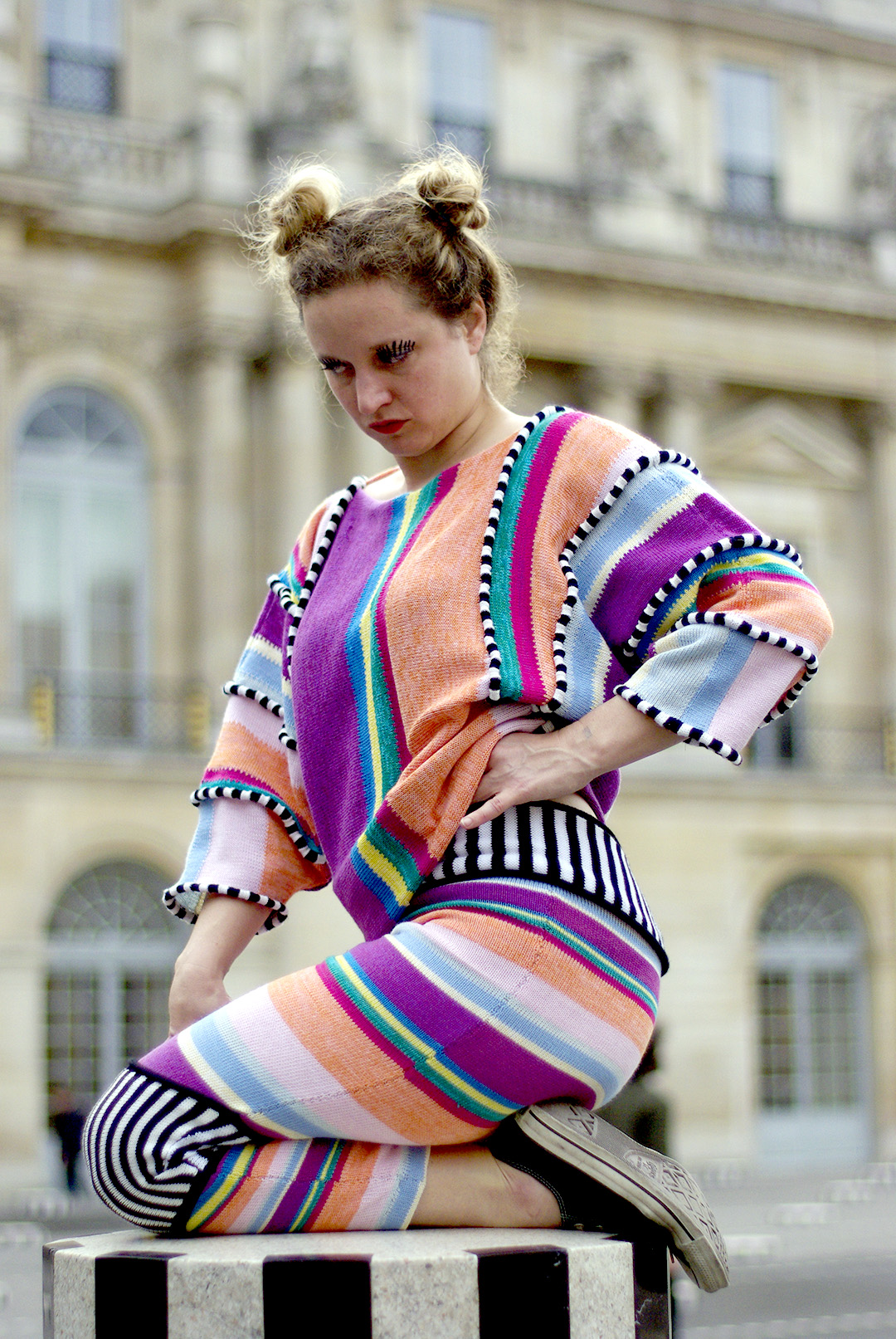 Le pull en maille fully-fashioned est tricoté à l’horizontale, en rayures multicolores, avec des manches chauve-souris encerclées de bourrelets en jacquard noir et blanc. Le legging en maille coupé-cousu est tricoté avec des rayures horizontales, avec des bandes de rayures noir et blanc sur la taille et encerclant les genoux, et avec des passepoils roulottés en jersey.